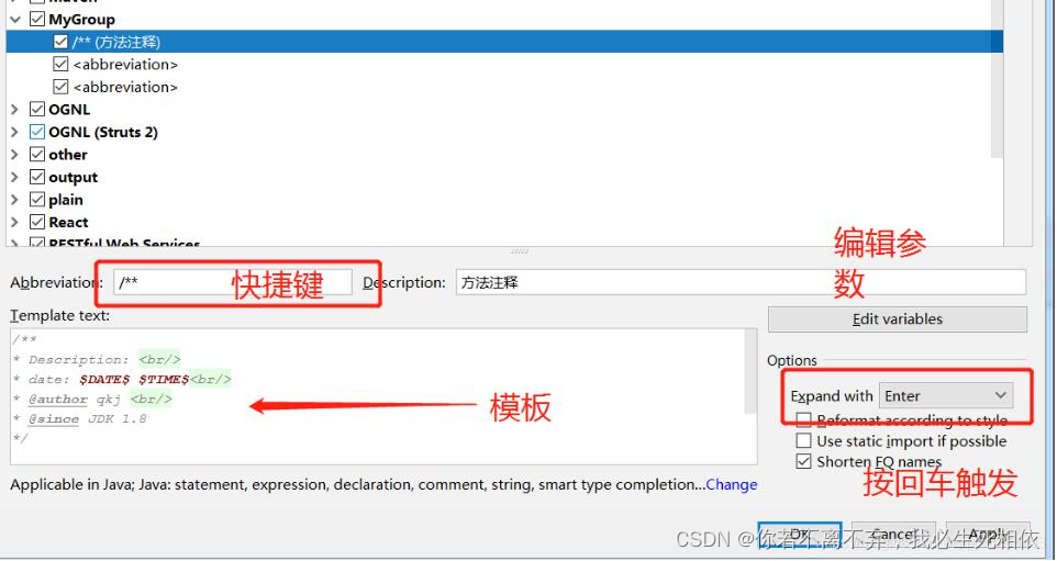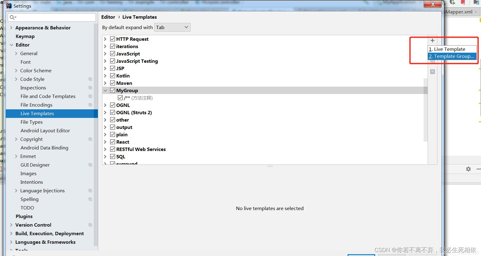 settings-- editor --Live Templates 右侧点击+ 选择template group新建模板组,再选中刚刚新建的模板组,点击+ 选择live template,