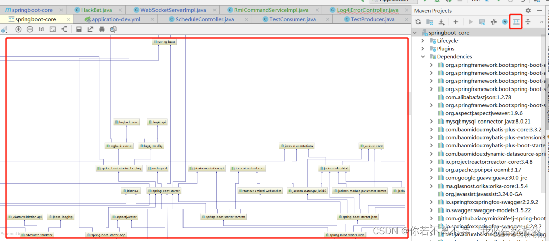 我们可以在idea右上角点击这个ShowDependencies按钮 以图片形式展示出来 图片按住ctrl和鼠标滑轮 可以放大,这个在排除依赖冲突 查看jar包来源时 非常好用