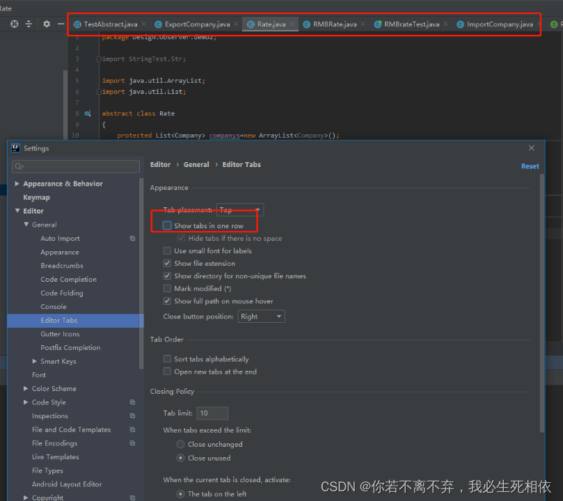 idea默认是选择显示单行的,我们把这个去掉,就可以显示多行tab了,在打开tab过多时的场景非常方便!
