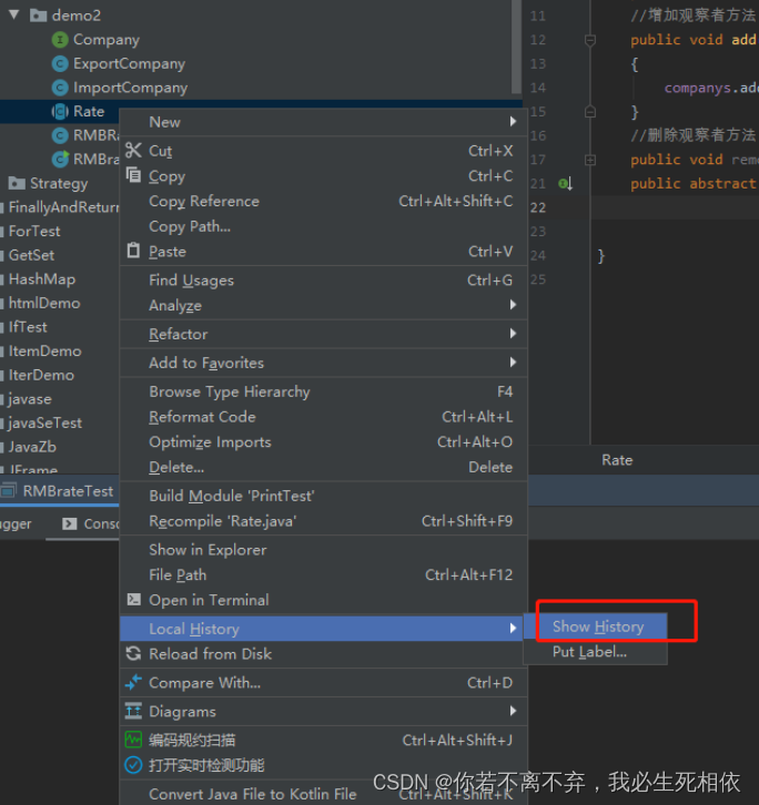 鼠标在需要查看的java类 右键 找到Local History >> Show History 点开即可看到历史版本,常用于自己忘记代码改了哪些内容 或需要恢复至某个版本 (注意 只能看近期修改 太久了也是看不到的)