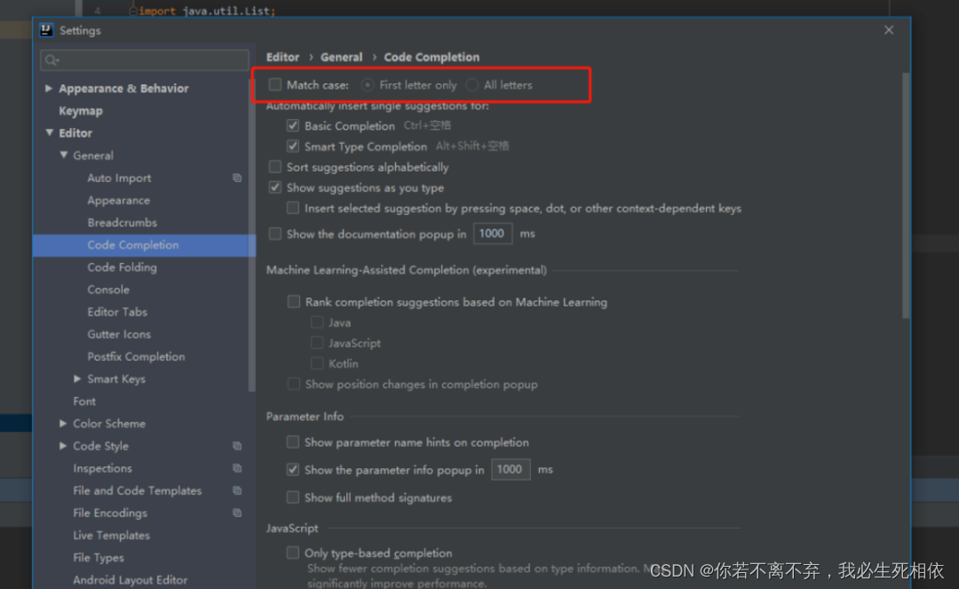 把这个勾去掉,(有的idea版本是选择选项 选择none即可),例如String 输入string 、String 都可以提示
