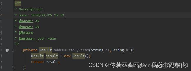 groovyScript("def result=''; def stop=false; def params=\"${_1}\".replaceAll('[\\\\[|\\\\]|\\\\s]', '').split(',').toList(); if (params.size()==1 && (params[0]==null || params[0]=='null' || params[0]=='')) { stop=true; }; if(!stop) { for(i=0; i < params.size(); i++) {result +=((i==0) ? '' : '') + ((i < params.size() - 1) ? '* @param: ' + params[i] + '\\r\\n' : '* @param: ' + params[i] + '')}; }; return result;", methodParameters())方便查看方法与方法之间的间隔,在代码不规范的项目中 很好用!