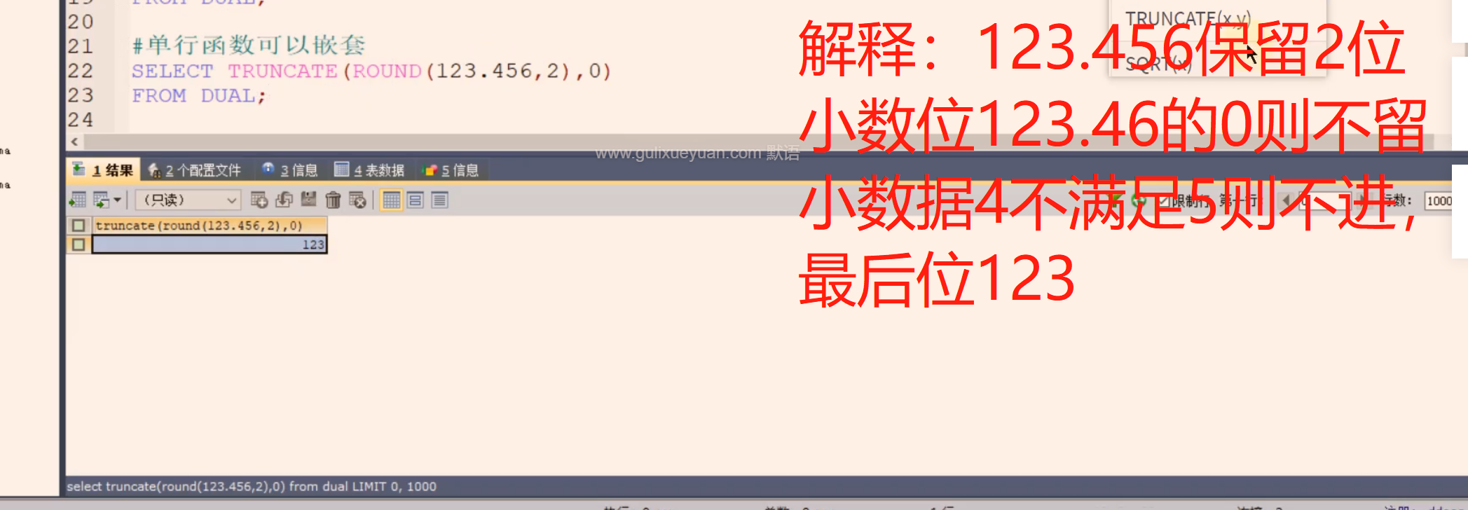 ROUND(12.33),ROUND(12.343,2),ROUND(12.324,-1),TRUNCATE(12.66,1),TRUNCATE(12.66,-1)
