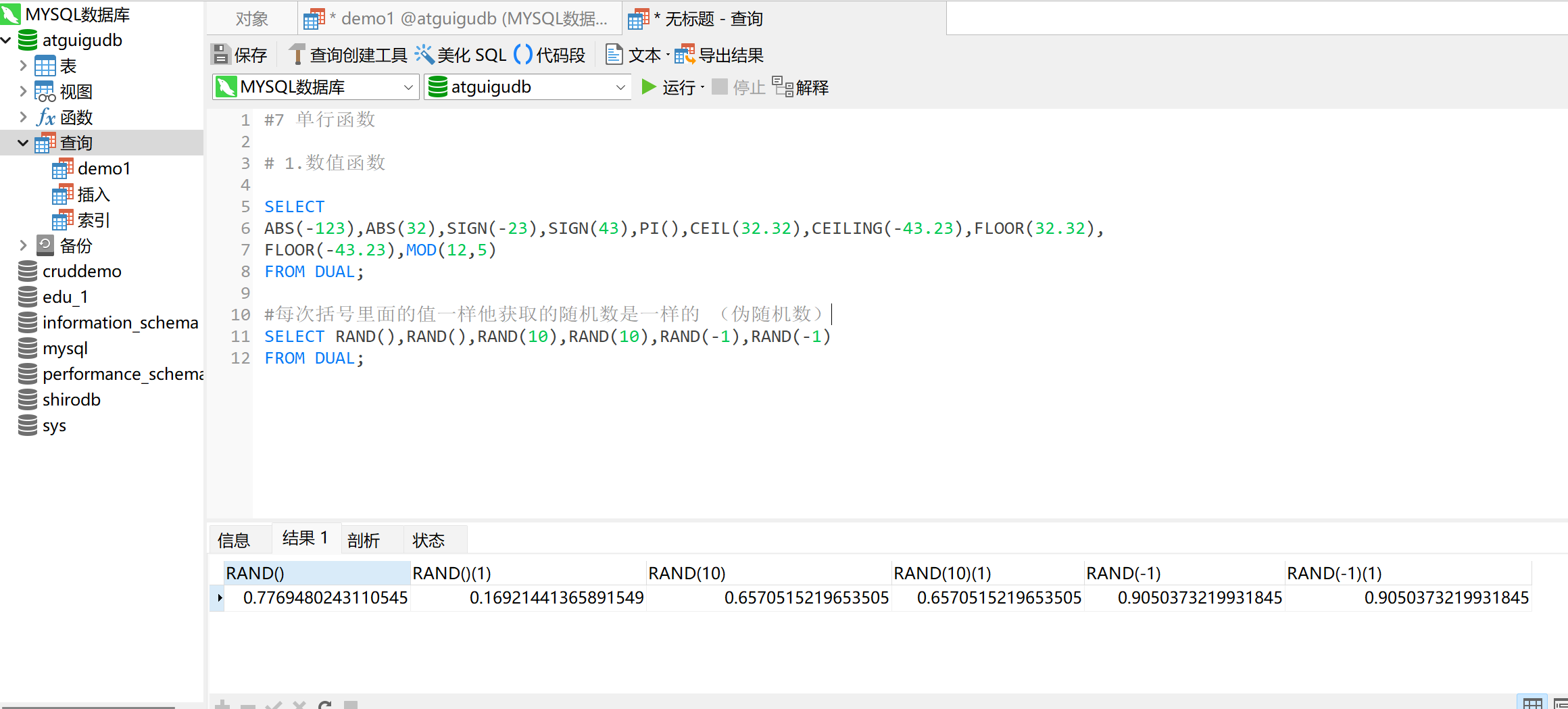 ABS(-123),ABS(32),SIGN(-23),SIGN(43),PI(),CEIL(32.32),CEILING(-43.23),FLOOR(32.32),