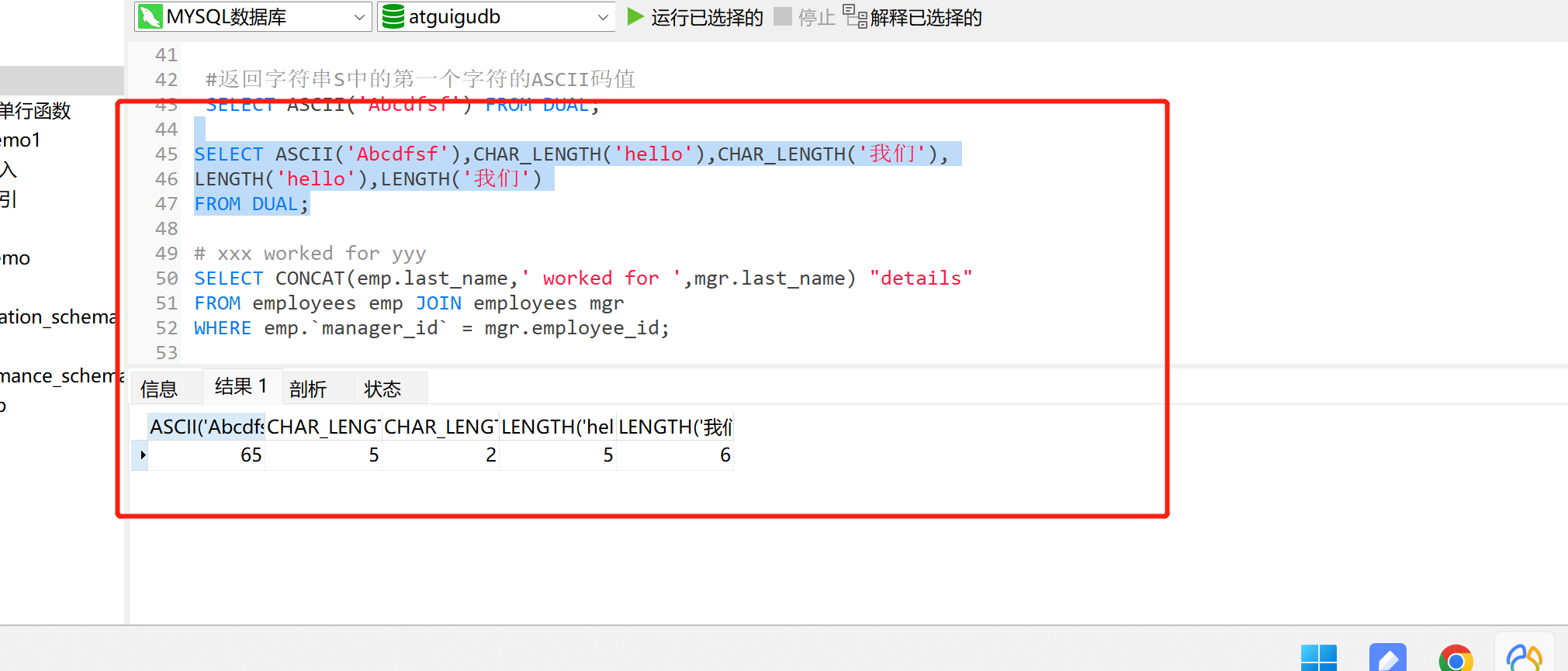 CHAR_LENGTH(s) | 返回字符串s的字符数。作用与CHARACTER_LENGTH(s)相同 |