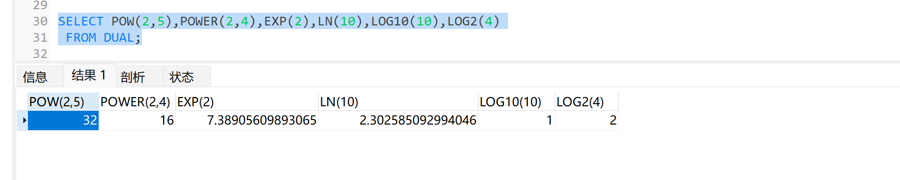 | POW(2,5) | POWER(2,4) | EXP(2) | LN(10) | LOG10(10) | LOG2(4) |