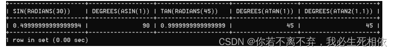 SELECT RADIANS(30),RADIANS(60),RADIANS(90),DEGREES(2*PI()),DEGREES(RADIANS(90))