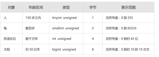 整数类型 | TINYINT、SMALLINT、MEDIUMINT、 INT(或INTEGER) 、BIGINT |