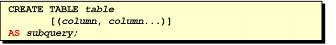 CREATE TABLE emp2 AS SELECT * FROM employees WHERE 1 = 2 ; -- 创建的emp2是空表CREATE TABLE dept