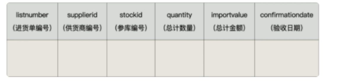 假设我们用 进货单头表 (demo.importhead)来保存进货单的总体信息,包括进货单编号、供货商编号、仓库编号、总计进货数量、总计进货金额和验收日期。