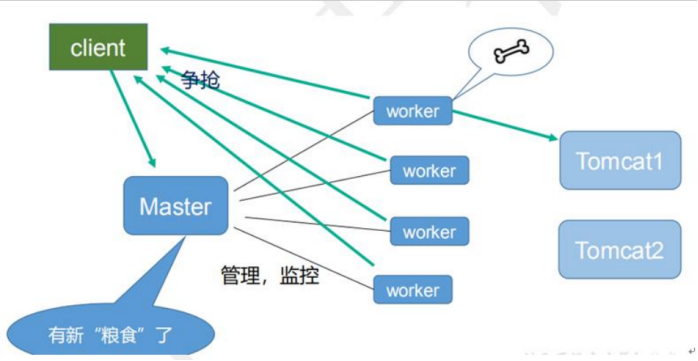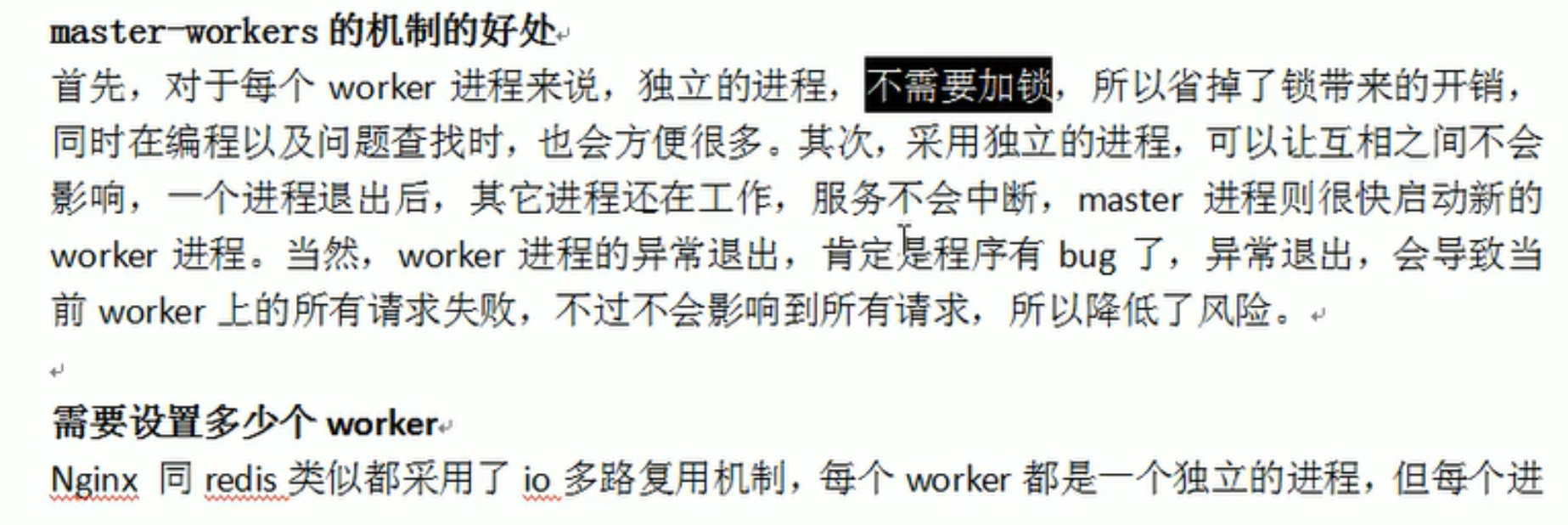 (2)每个 woker 是独立的进程,如果有其中的一个 woker 出现问题,其他 woker 独立的,继续进行争抢,实现请求过程,不会造成服务中断