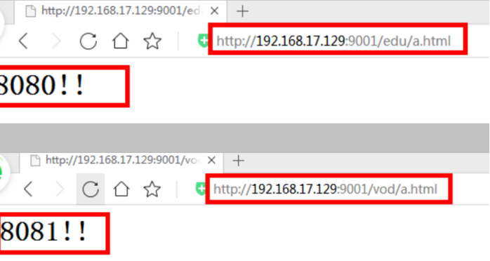 (1)浏览器地址栏输入地址 http://192.168.17.129/edu/a.html,负载均衡效果,平均 8080 和 8081 端口中