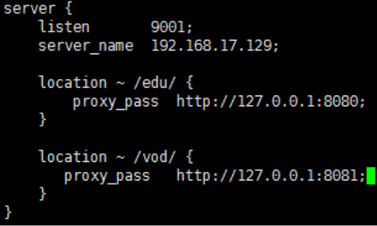 使用 nginx 反向代理,根据访问的路径跳转到不同端口的服务中 nginx 监听端口为 9001, 访问 http://192.168.17.129:9001/edu/ 直接跳转到 127.0.0.1:8080 访问 http:// 192.168.17.129:9001/vod/ 直接跳转到 127.0.0.1:8081