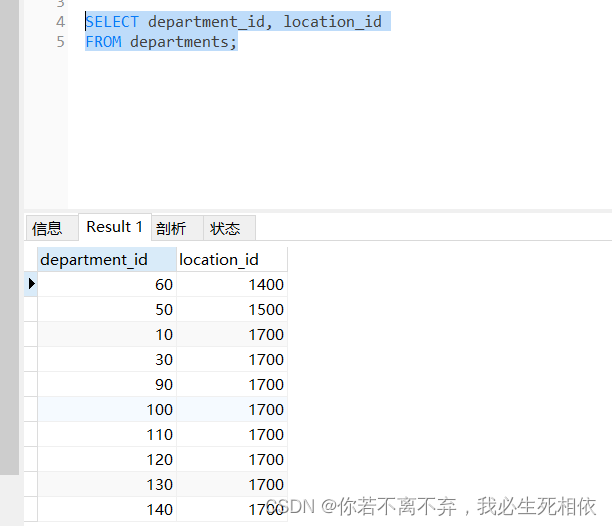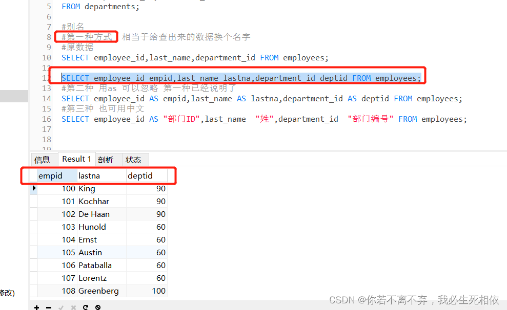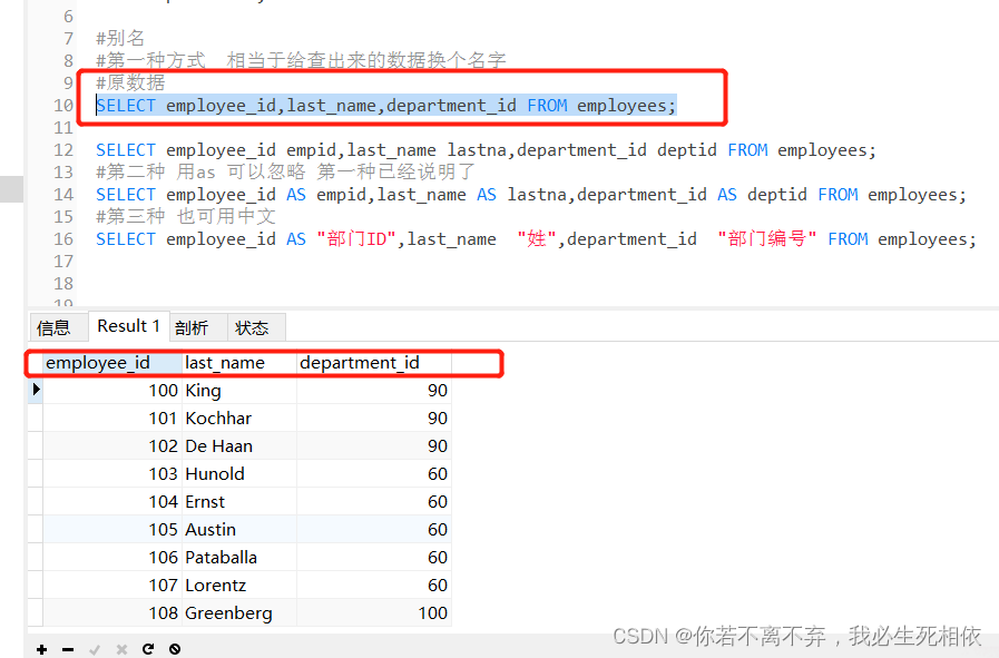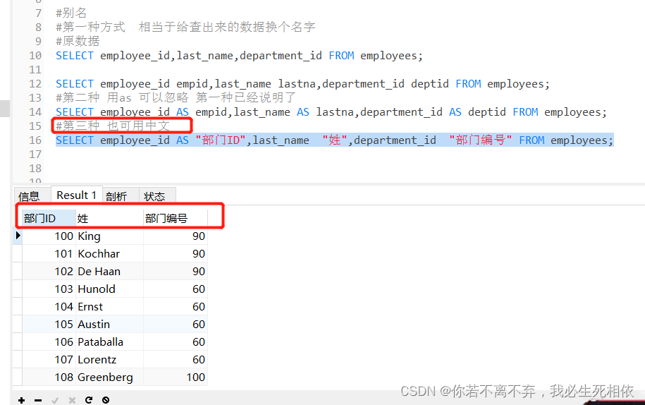 SELECT employee_id AS "部门ID",last_name "姓",department_id "部门编号" FROM employees;