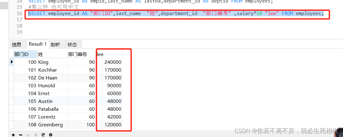 SELECT employee_id AS "部门ID",last_name "姓",department_id "部门编号" ,salary*10 "lee" FROM employees;