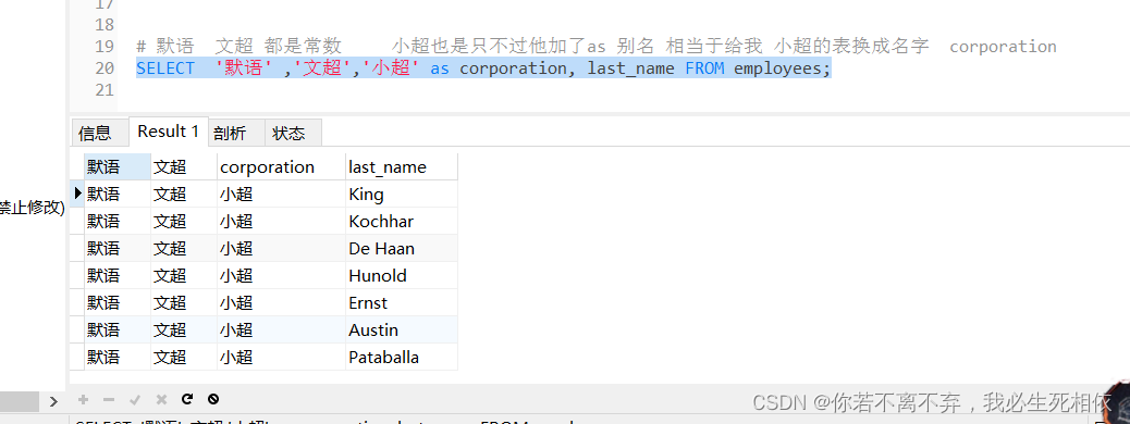 SELECT '小超' as corporation, last_name FROM employees;# 默语 文超 都是常数 小超也是只不过他加了as 别名 相当于给我 小超的表换成名字 corporation