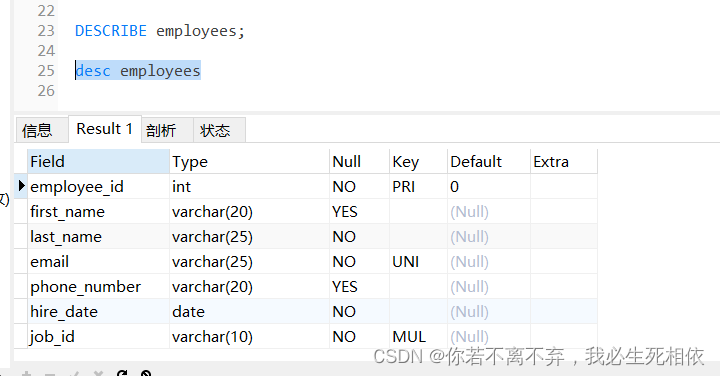 使用DESCRIBE 或 DESC 命令,表示表结构。