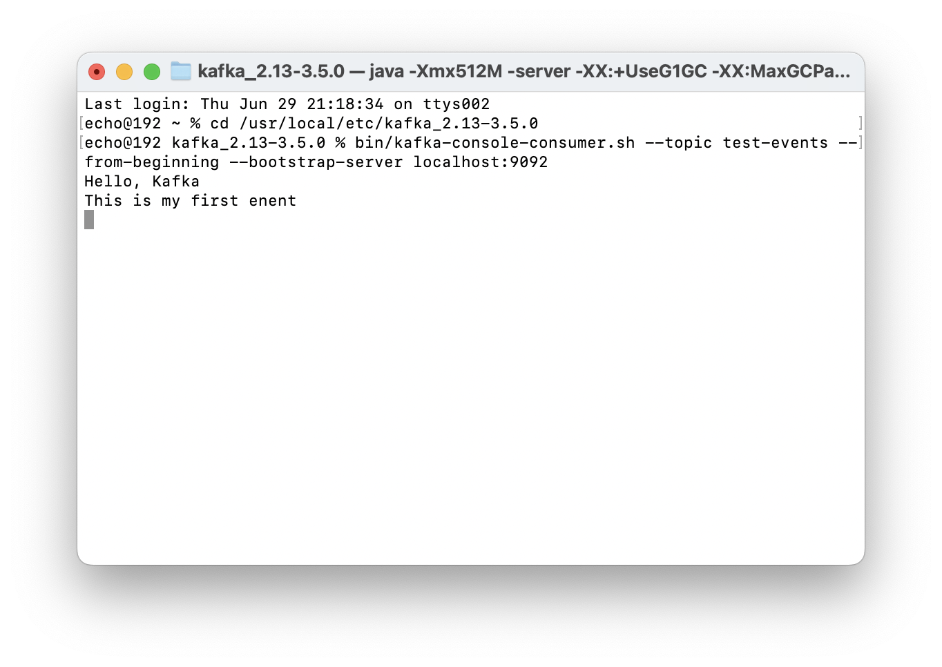 bin/kafka-console-consumer.sh --topic test-events --from-beginning --bootstrap-server localhost:9092之前的命令都运行成功的话,可以看到上一步发送的两条消息。 可以随时使用 Ctrl + C 停止消费者客户端。
