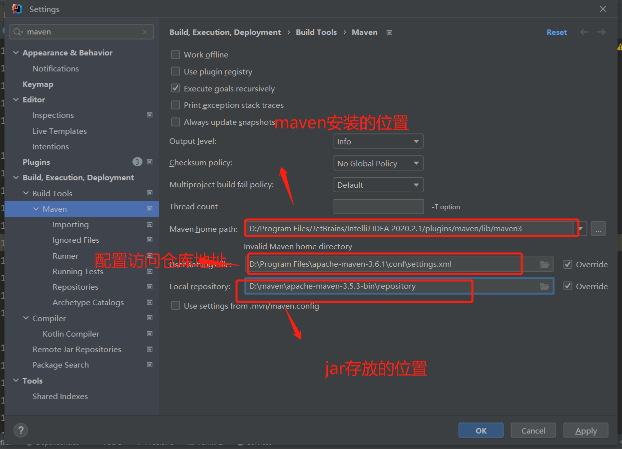 D:\maven\apache-maven-3.5.3-bin\repository 是我存在下载jar的地址 大家需要修改为自己的