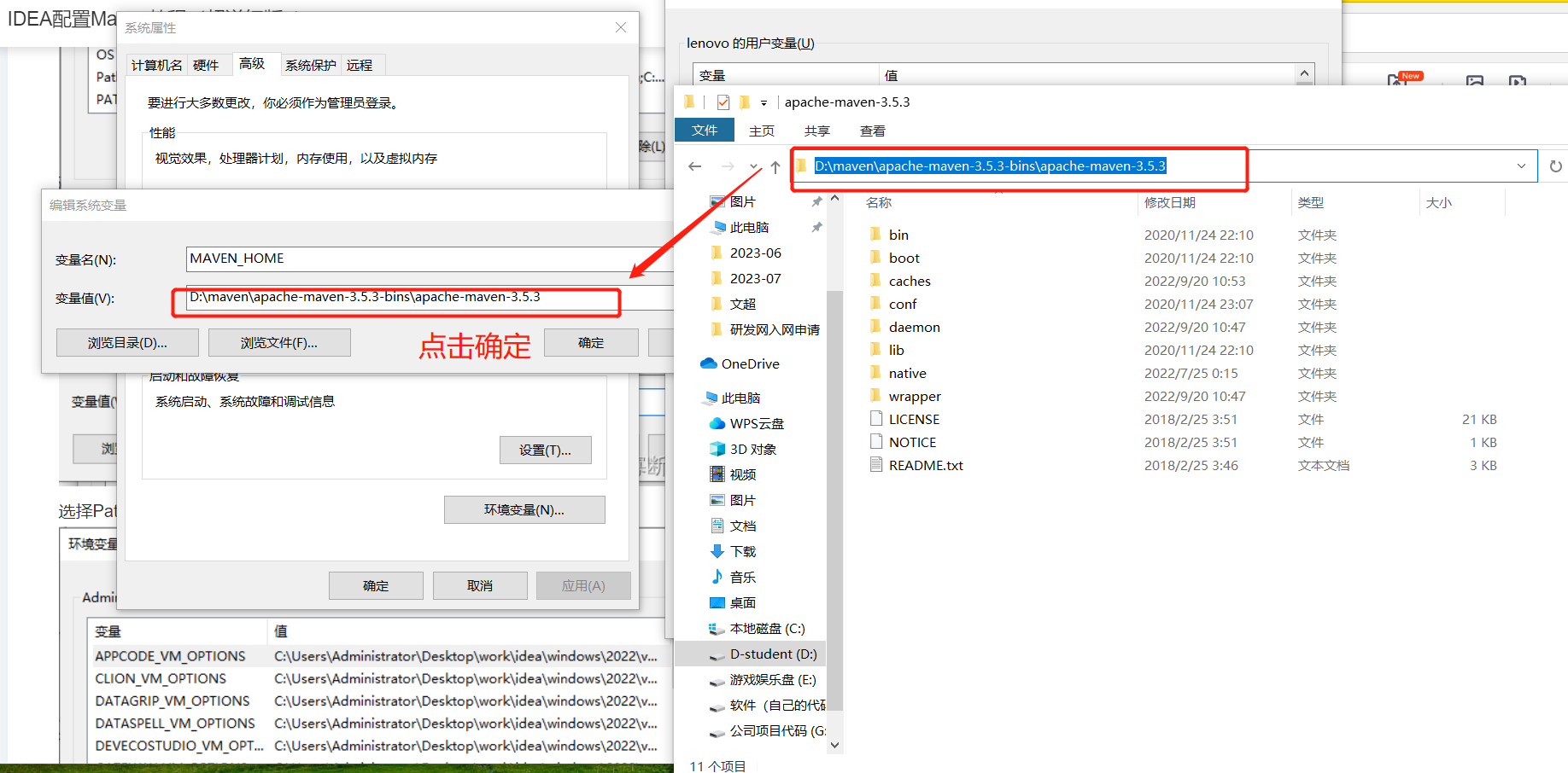 变量名为MAVEN_HOME, 变量值为D:\maven\apache-maven-3.5.3-bins\apache-maven-3.5.3,点击确定;