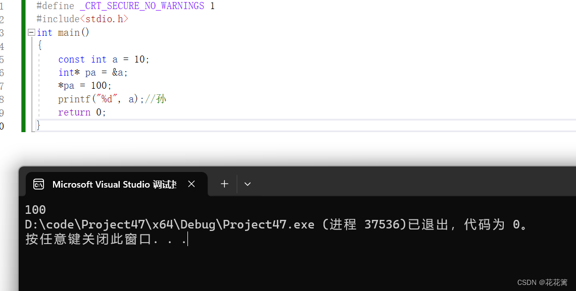 但是,此时a已经被const修饰,我门直接修改a的值是无法运行的,但是我门通过指针获得a的地址,在通过解引用操作,直接修改pa指向的空间地址的值,即可达到修改a的值的操作。