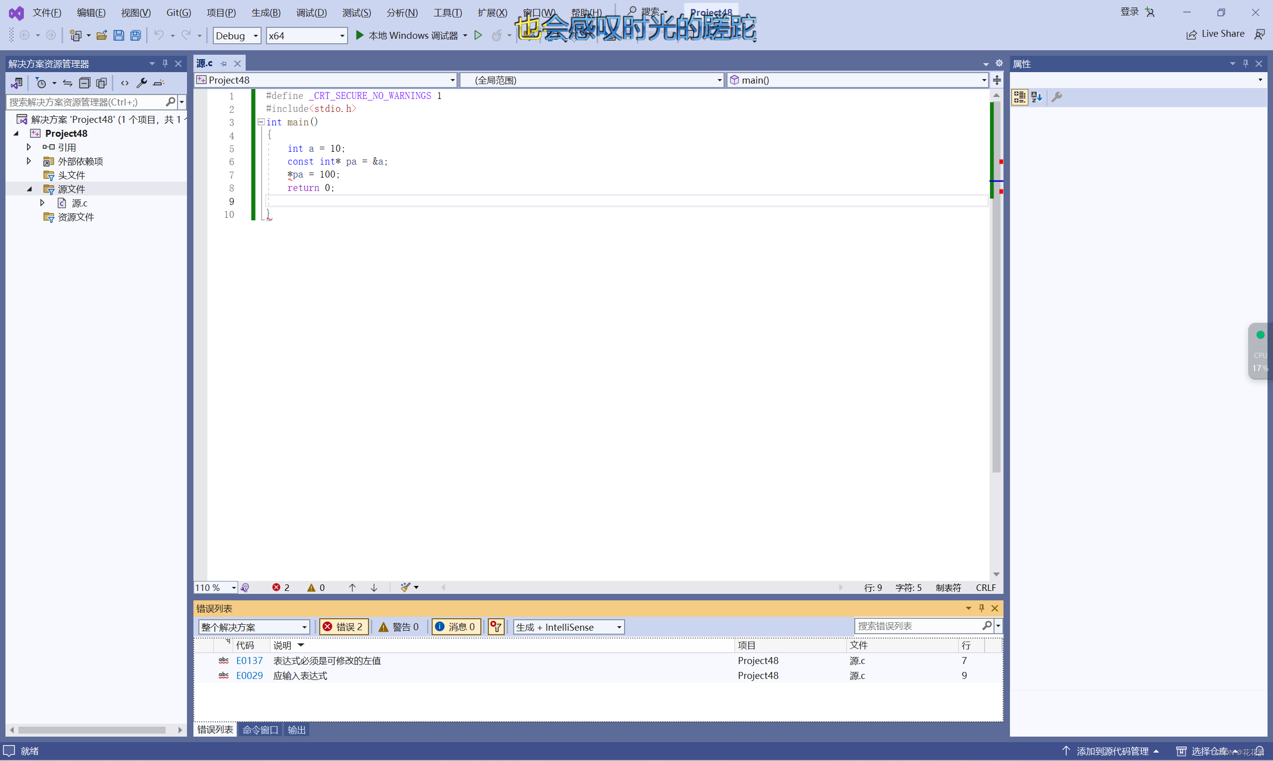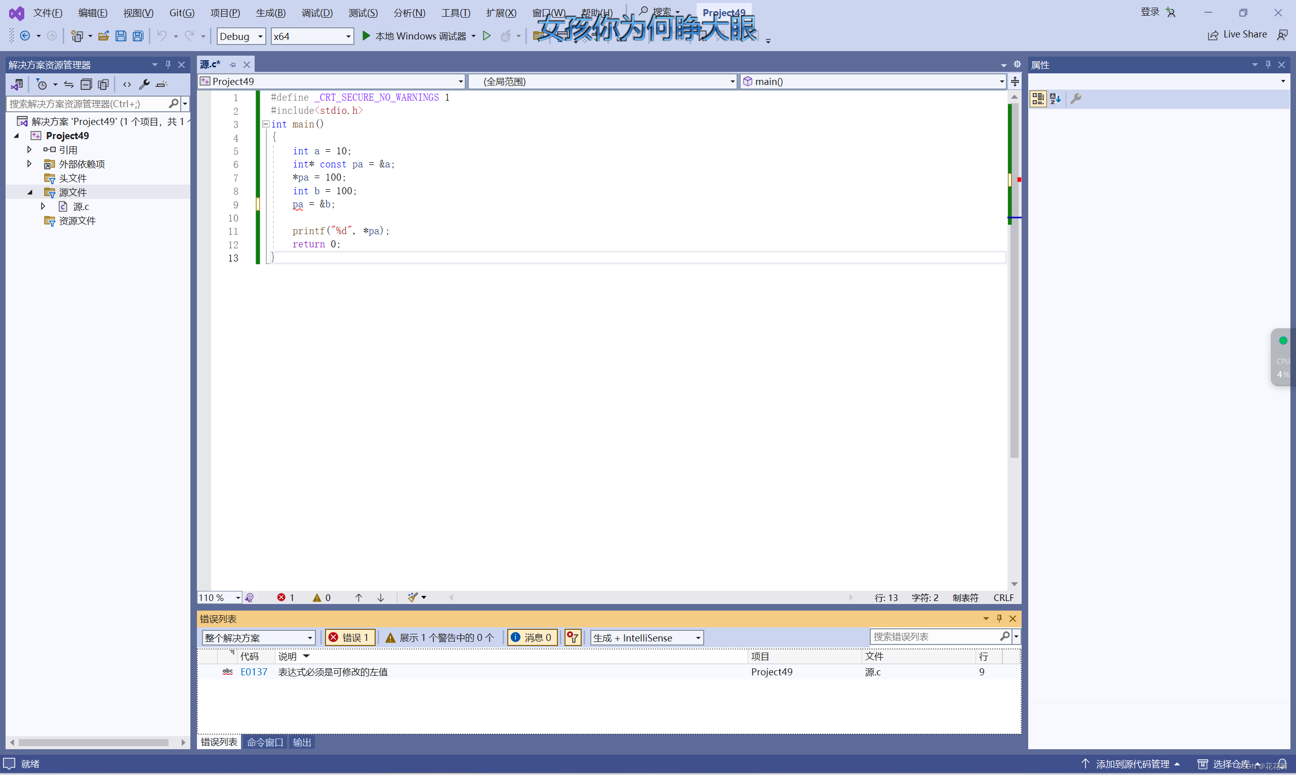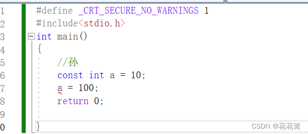 在用const修饰变量时,在定义后,当我在此对a的值进修改,此时编译器就提示左侧必须是可修改的变量,因为在const修饰之后,变量a的值就无法进行修改了。
