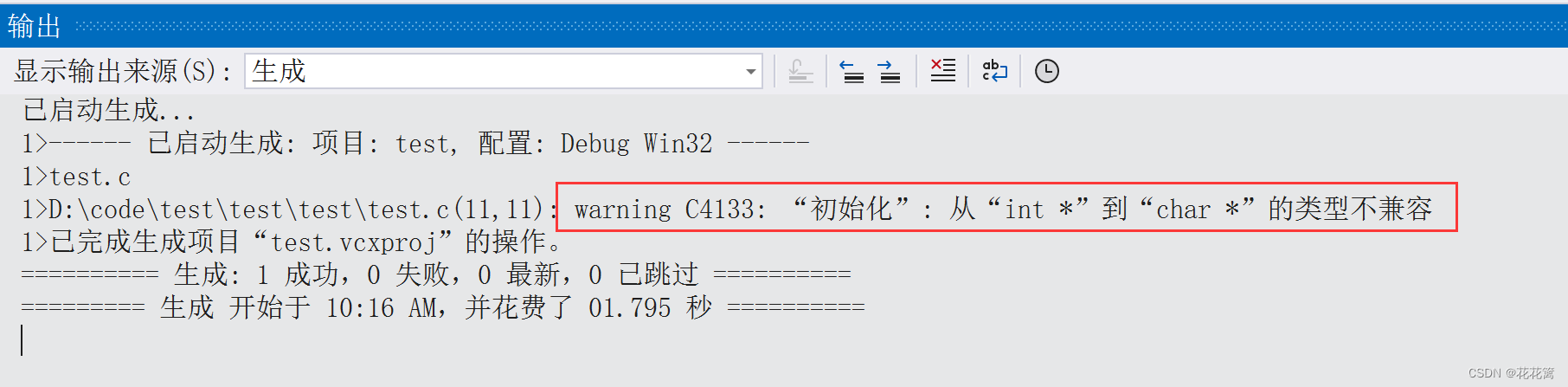 }在上⾯的代码中,将⼀个int类型的变量的地址赋值给⼀个char*类型的指针变量。编译器给出了⼀个警告(如下图),是因为类型不兼容。⽽使⽤void*类型就不会有这样的问题。