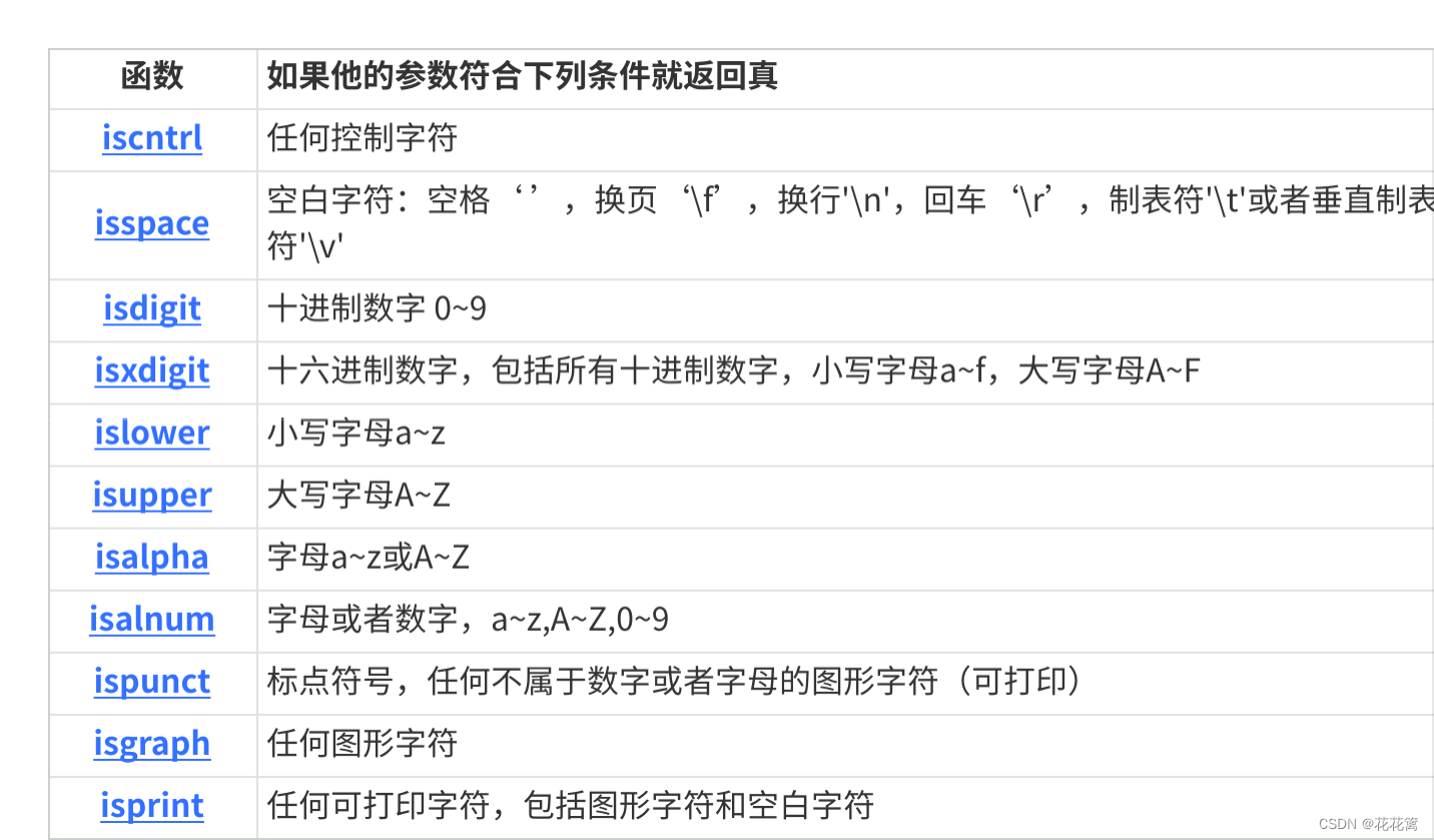 C语⾔中有⼀系列的函数是专⻔做字符分类的,也就是⼀个字符是属于什么类型的字符的。这些函数的使⽤都需要包含⼀个头⽂件是 ctype.h