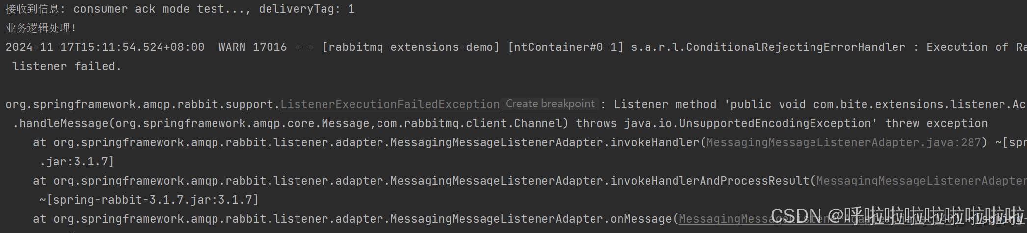 2024-11-17T15:19:11.420+08:00 WARN 22936 --- [rabbitmq-extensions-demo] [ntContainer#0-1] s.a.r.l.ConditionalRejectingErrorHandler : Execution of Rabbit message listener failed.