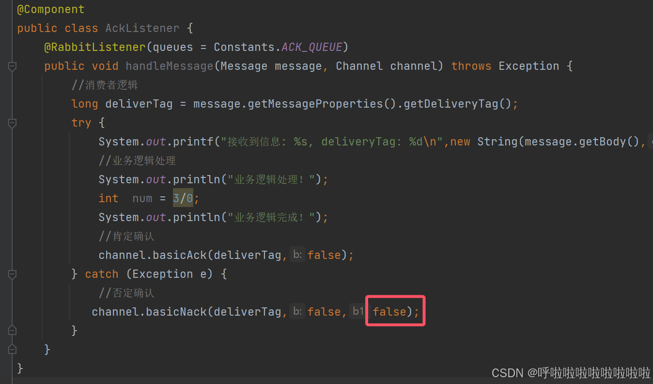 3)requeue 表⽰拒绝后,这条消息如何处理.如果requeue参数设置为true,则RabbitMQ会重新将这条 消息存⼊队列,以便可以发送给下⼀个订阅的消费者.如果requeue参数设置为false,则RabbitMQ会把消息从队列中移除,⽽不会把它发送给新的消费者.