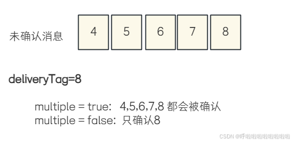 2)multiple 是否批量确认.在某些情况下,为了减少⽹络流量,可以对⼀系列连续的 deliveryTag 进 ⾏批量确认.值为true则会⼀次性ack所有⼩于或等于指定deliveryTag的消息.值为false,则只确认当前指定deliveryTag的消息.