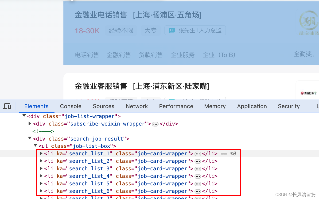 通过开发者模式看到,每一个岗位信息都在一个<li>标签中,其中的ka属性会从1开始累加,我们要获取300条数据,那么一共就会累加到"search_list_300",在循环中通过上一步定义的num参数来进行不断累加,达到获取每一个岗位的要求