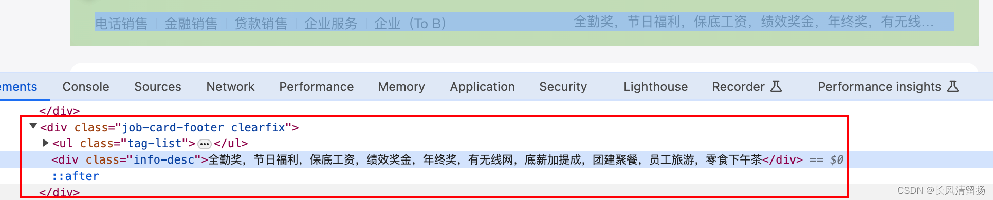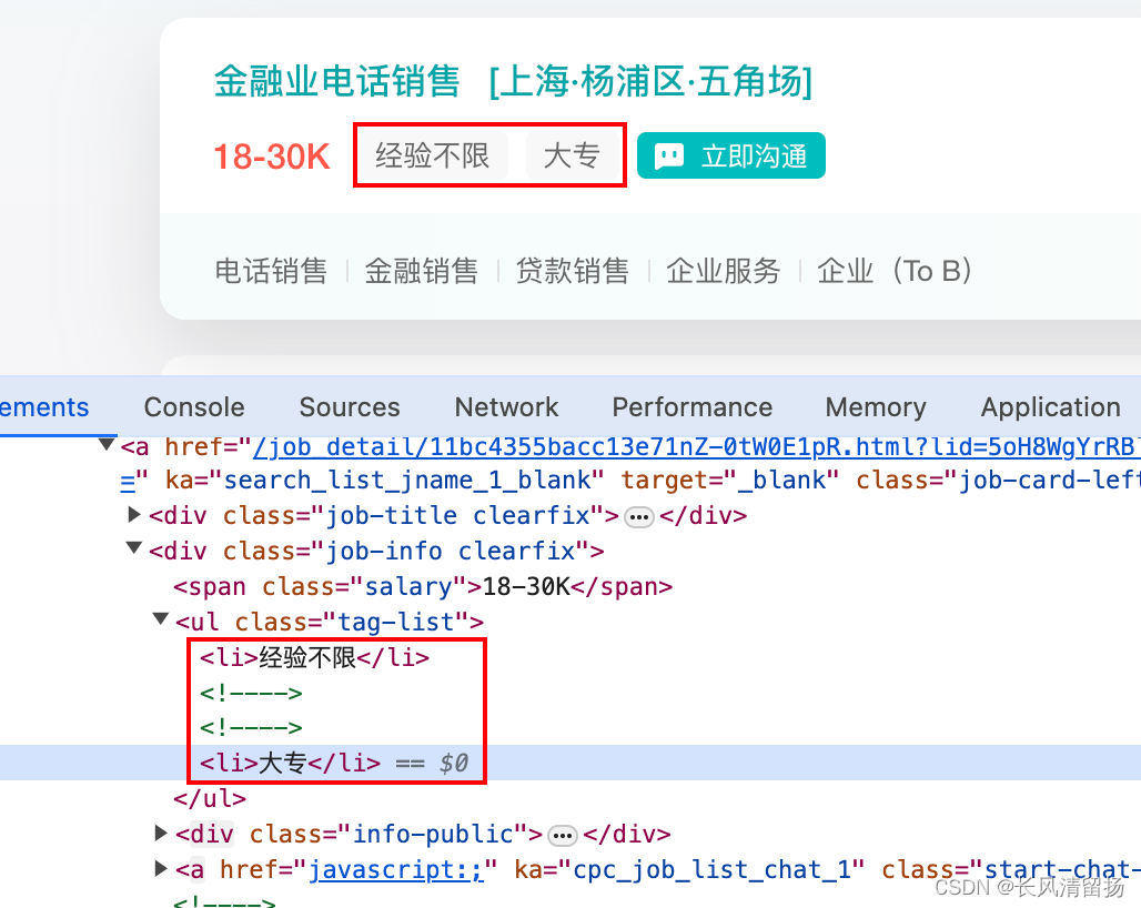 可以看到工作经验要求在<ul>标签下的每一个<li>标签中,可能会存在两个或者三个不等,或者就是没有该信息,那么就通过 find_elements 来获取每一个<li>标签