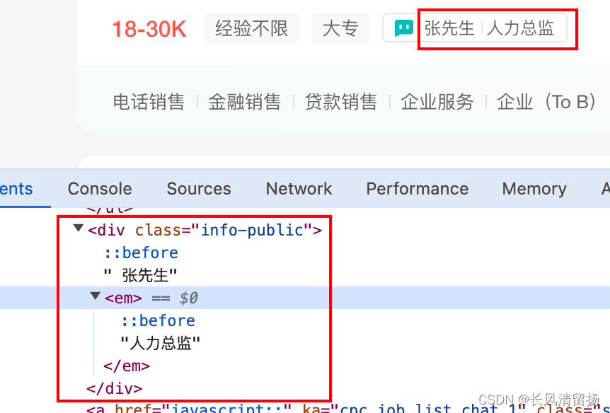 像这样的情况,招聘人和招聘人岗位都在<div>标签下,但是招聘人岗位在<div>标签下的<em>标签中,如果直接输出<div>标签中的内容的话,结果就是 “张先生人力总监”,但是最终的结果想变成分开的,招聘人是一个字段,招聘人所属岗位是一个字段,操作实现请往下看