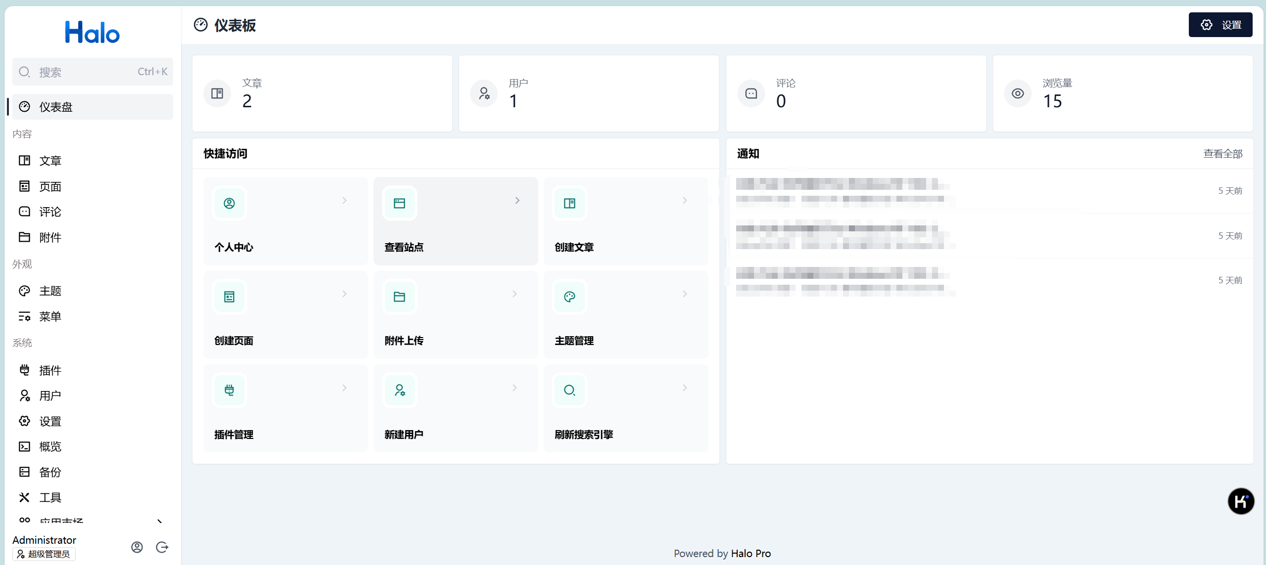 进入管理面板的应用管理,管理员目录地址之后进入halo的管理面板