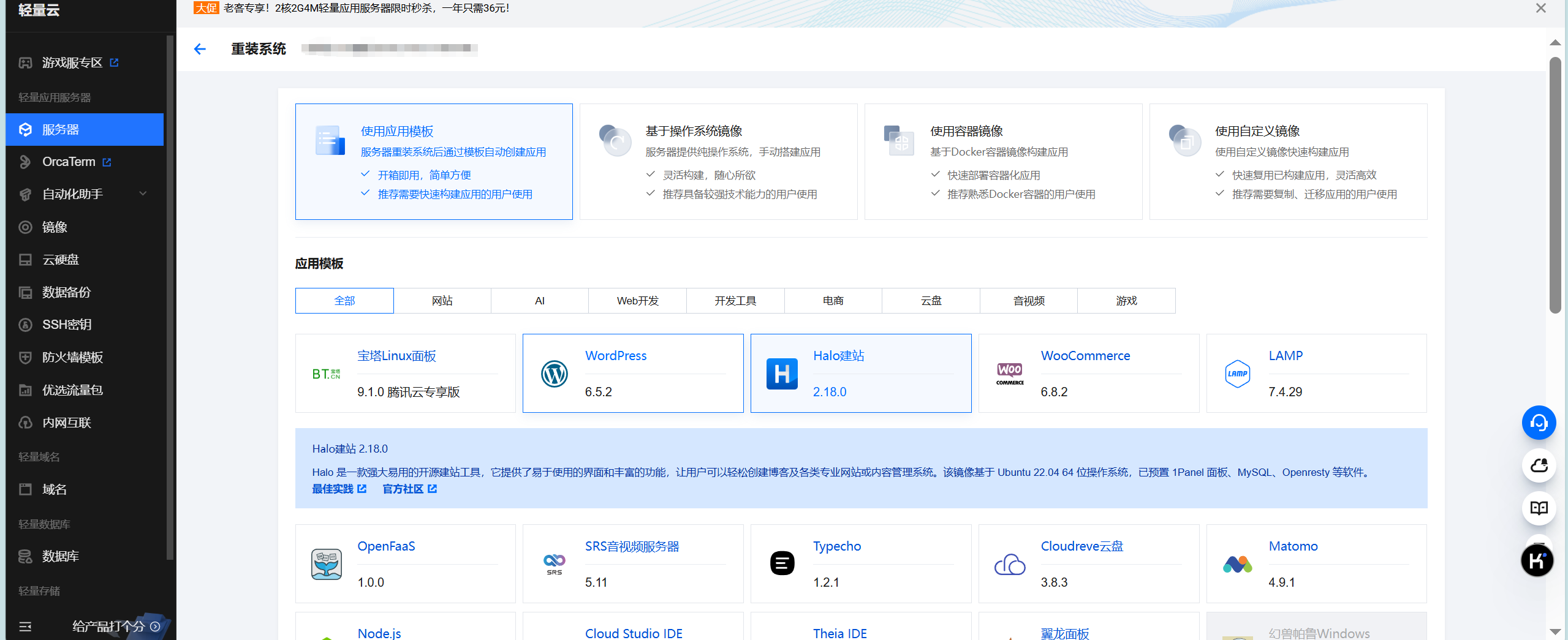 登录腾讯云轻量应用服务器控制台,选择适合的配置。对于Halo博客系统,以下是我的配置: