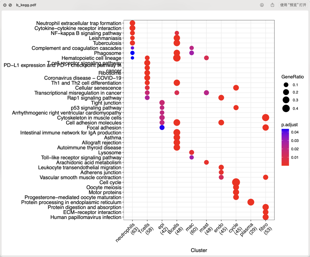 而且我在前面的 走inferCNV流程的时候只需要针对上皮细胞即可和上皮细胞里面混入了淋巴系和髓系免疫细胞呢 做好了上皮细胞的细分,也给出来了针对不同单细胞亚群的特异性基因进行go和kegg数据库注释的方法,如下所示可以看到我们的第一层次降维聚类分群是合理的。成纤维单细胞亚群的top100的特异性基因确实是会富集到 "Focal adhesion" 和 "ECM-receptor interaction" 。而我们前面的芯片表达量差异分析的癌症里面的上调基因也是富集到 "Focal adhesion" 和 "ECM-receptor interaction" 通路。