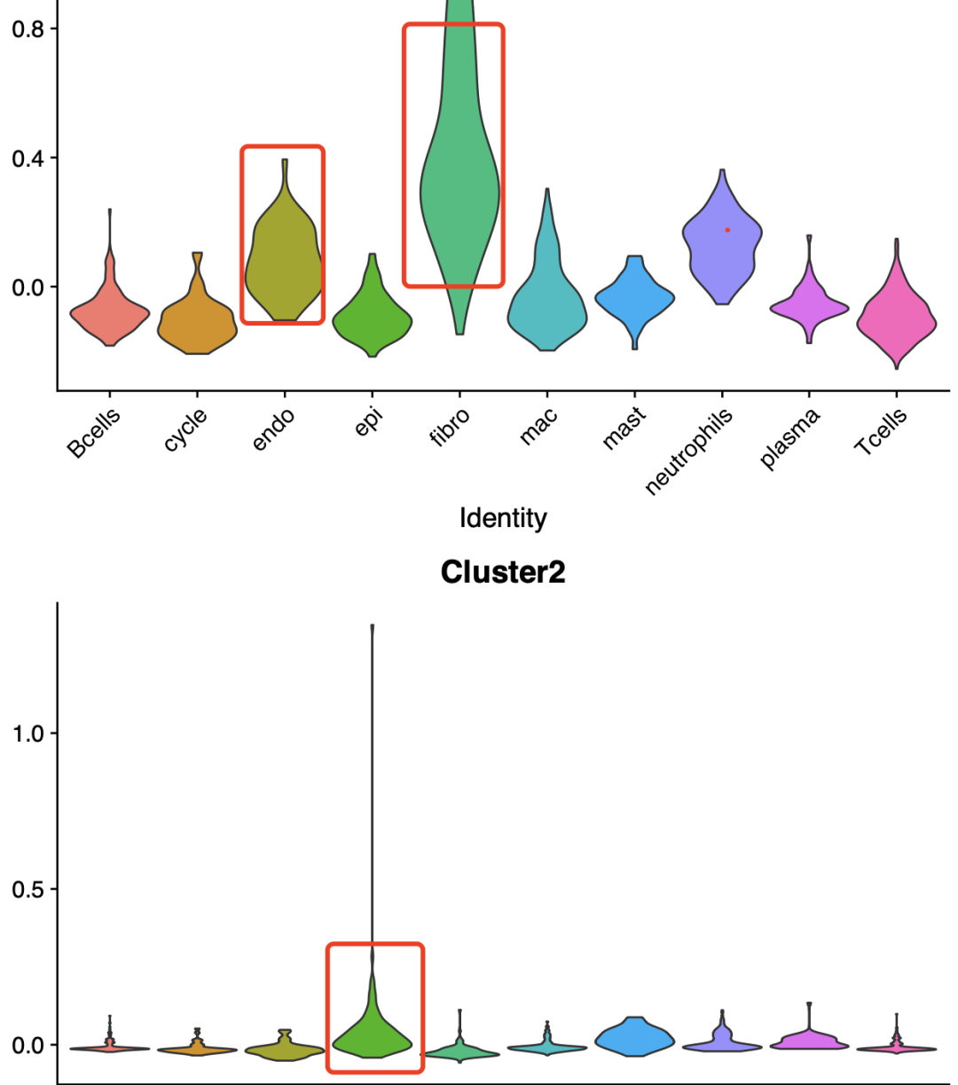可以很明显的看到这个GSE54129数据集的表达量差异分析后的上调基因列表主要是在内皮细胞和成纤维细胞里面的高表达量,而下调基因反而是在上皮细胞打分比较高: