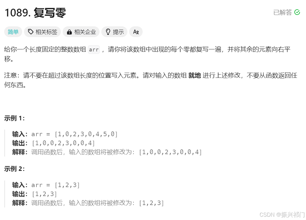 我们发现不能从前向后复写,因为会覆盖掉还没有被复写的数据 因此我们需要从后往前复写。 此时left应该指向最后一个被复写的数。 right指向数组最后一个元素 1.找到最后一个被复写的数据。我们用left指向 ①先判断left的位置0/非0 ②再决定right往后走一步还是两步 ③判断一下right是否走到最后 ④left++ 1.5 处理一下边界条件。 因为第一步完成后.right可能越界 我们手动完成最后一步的复写 2.从后向前。完成复写操作。 ①判断arr【left】是否为0.