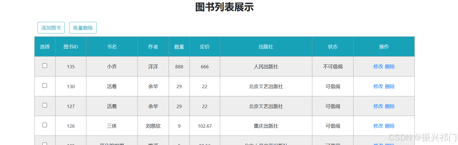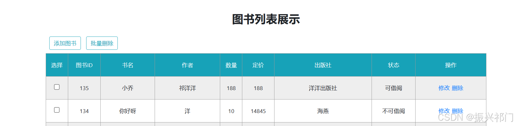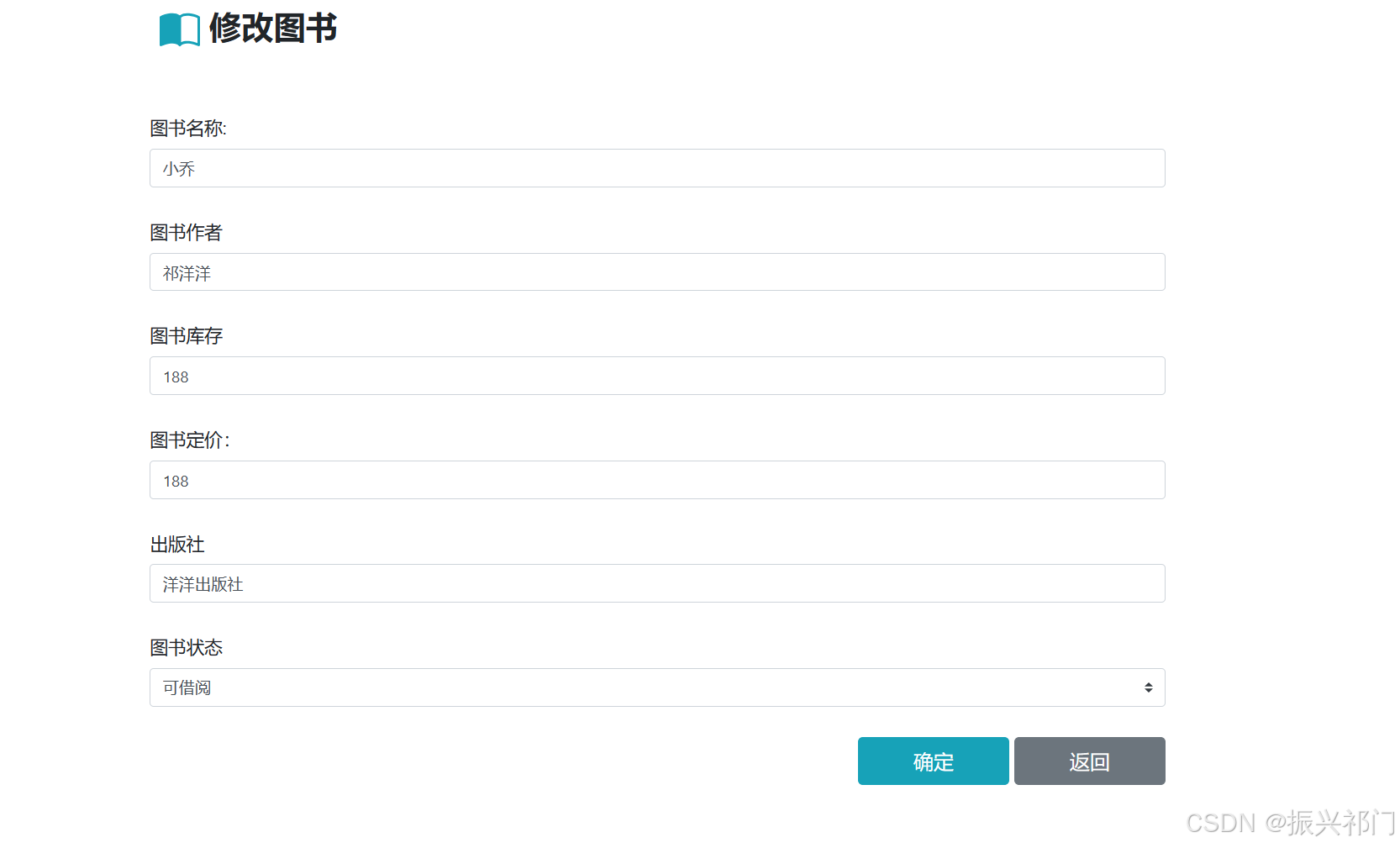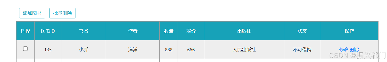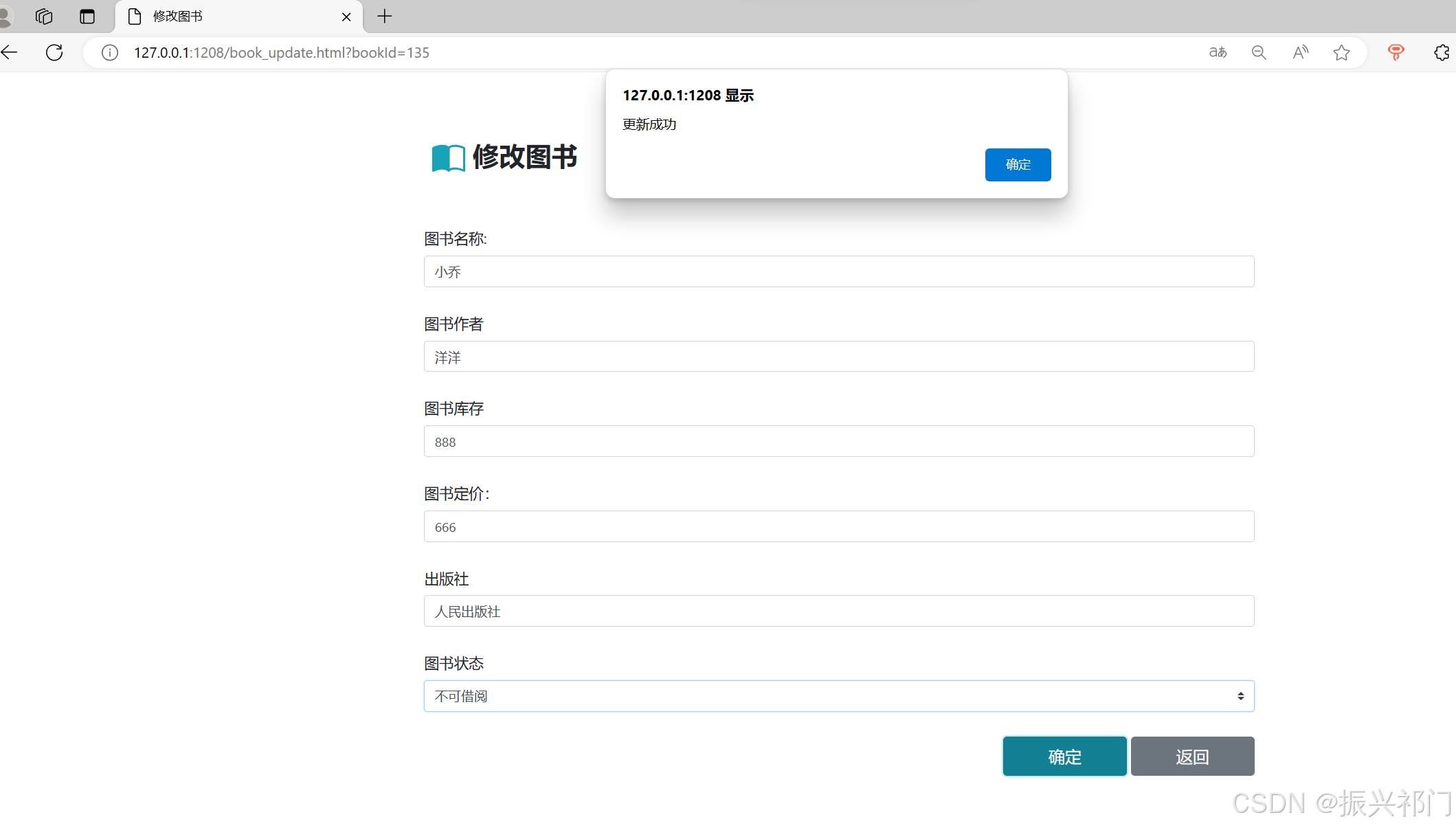 </script>比如我们要将图书ID为135的图书 作者 修改为 洋洋 数量 修改为 888 价格 修改为 666 出版社 修改为 人民出版社 可借阅 修改为 不可借阅