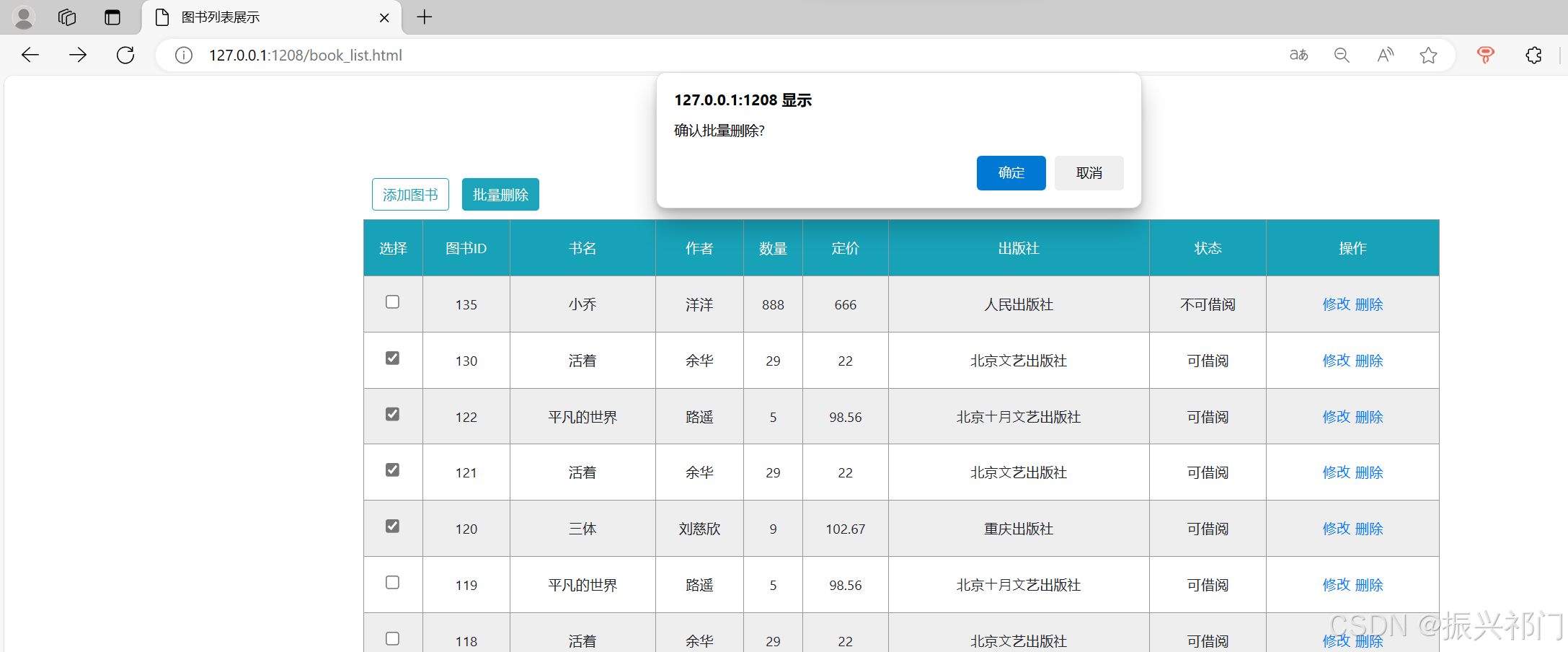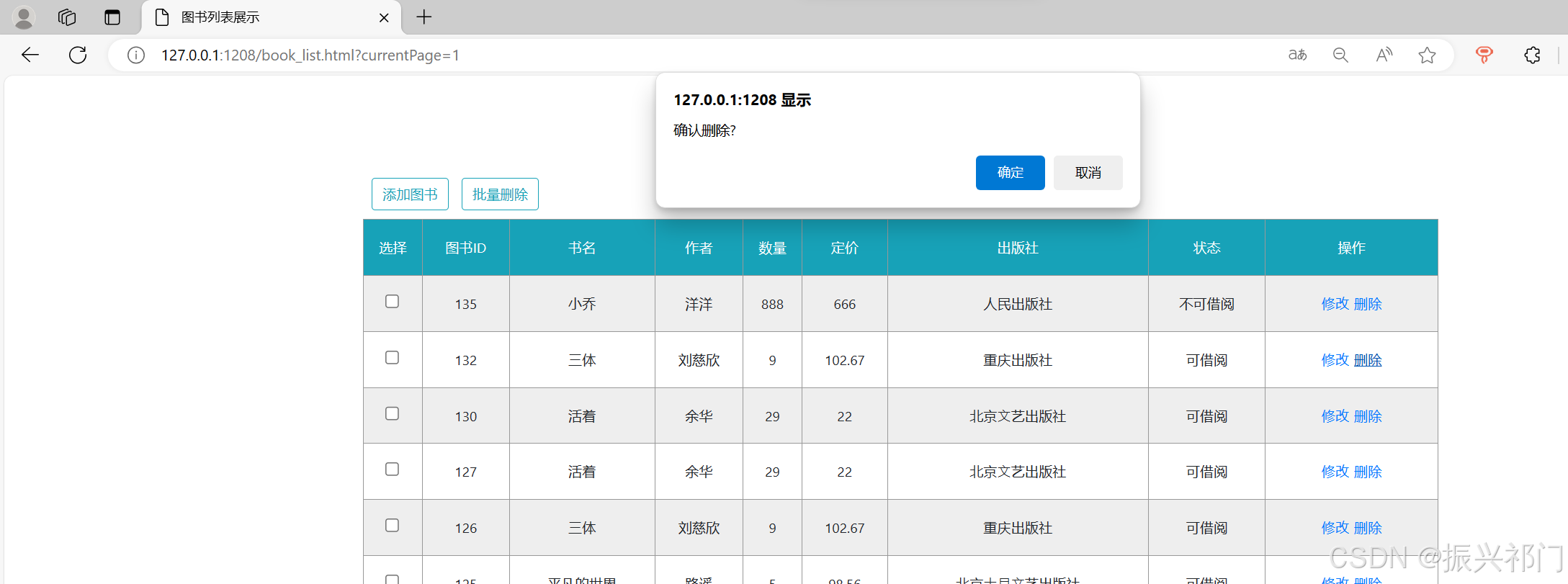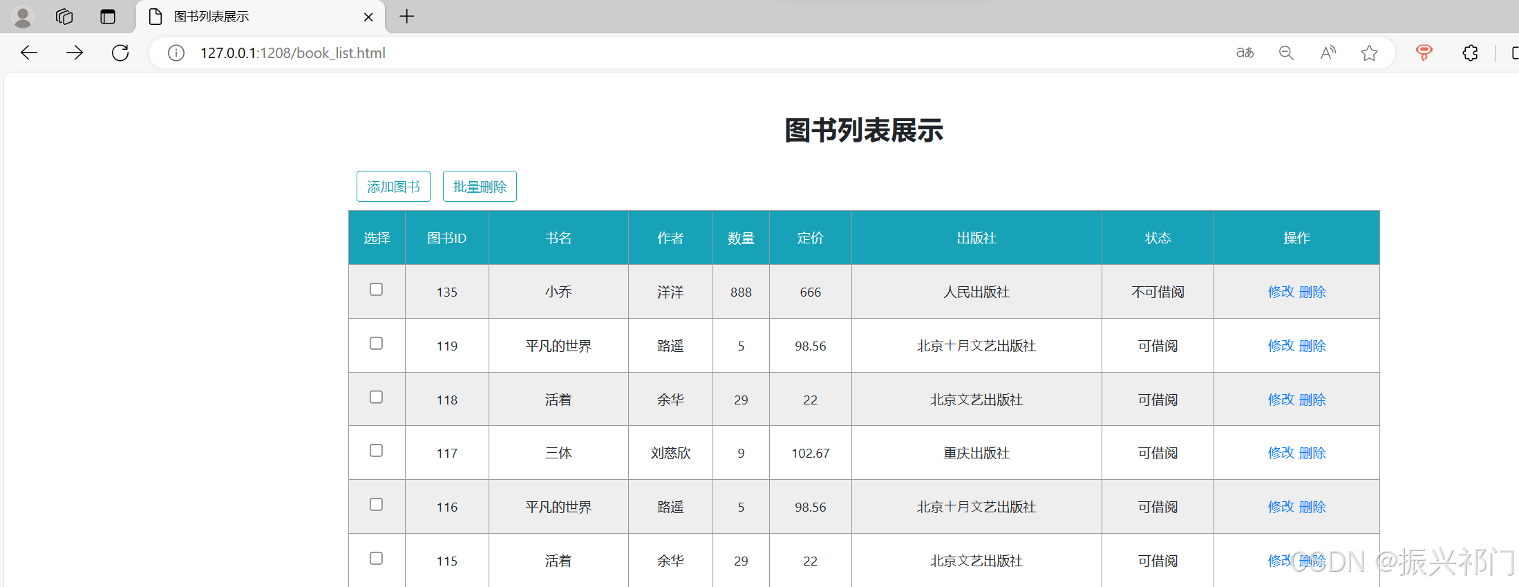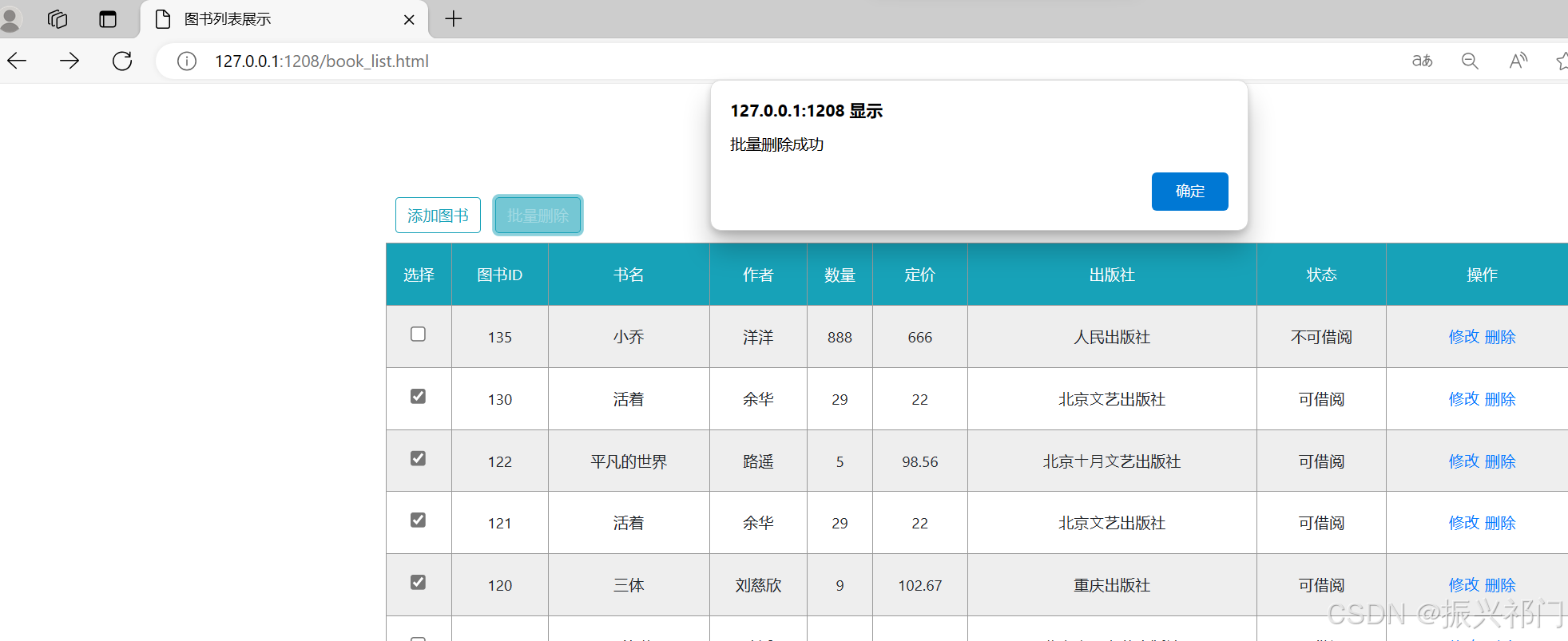 </script>比如我们要将图书ID为135的图书 作者 修改为 洋洋 数量 修改为 888 价格 修改为 666 出版社 修改为 人民出版社 可借阅 修改为 不可借阅