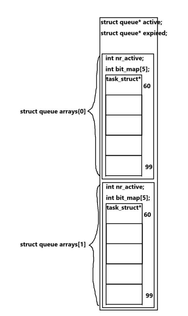 大致的简图就是上面这幅图,active指针指向的是arrays[0],expired指针指向的是arrays[1]。 CPU在调度的时候一般只会在active中调度,在调度中有三种情况: