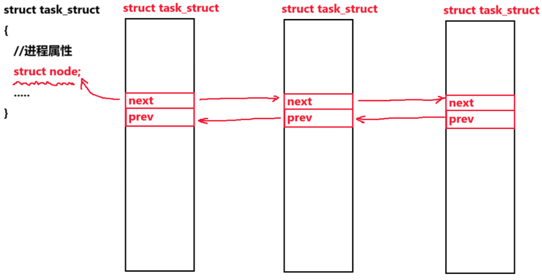 接下来讨论完调度算法之后我们来讨论一下每个进程之间到底是如何连接起来的,我们知道task_struct是以链式结构来完成的。 Linux中的task_struct是用双线链表来连接的。 我们熟知的链式结构就是: