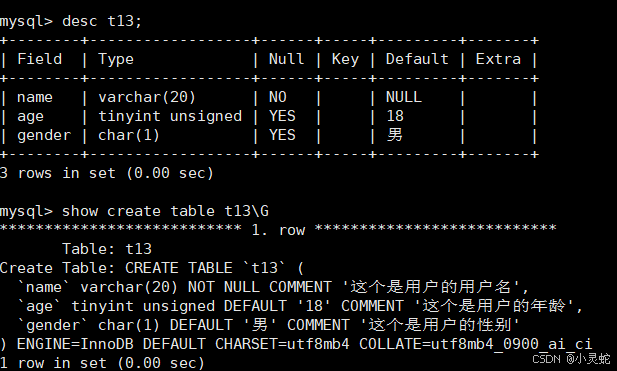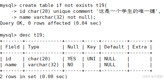 列描述:comment,没有实际含义,专门用来描述字段,会根据表创建语句保存,用来给程序员或DBA(数据库管理员)来进行了解。