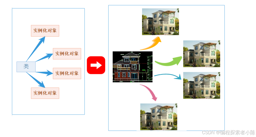 3.⼀个类可以实例化出多个对象,实例化出的对象 占⽤实际的物理空间,存储类成员变量。打个⽐ ⽅:类实例化出对象就像现实中使⽤建筑设计图建造出房⼦,类就像是设计图,设计图规划了有多 少个房间,房间⼤⼩功能等,但是并没有实体的建筑存在,也不能住⼈,⽤设计图修建出房⼦,房 ⼦才能住⼈。同样类就像设计图⼀样,不能存储数据,实例化出的对象分配物理内存存储数据。