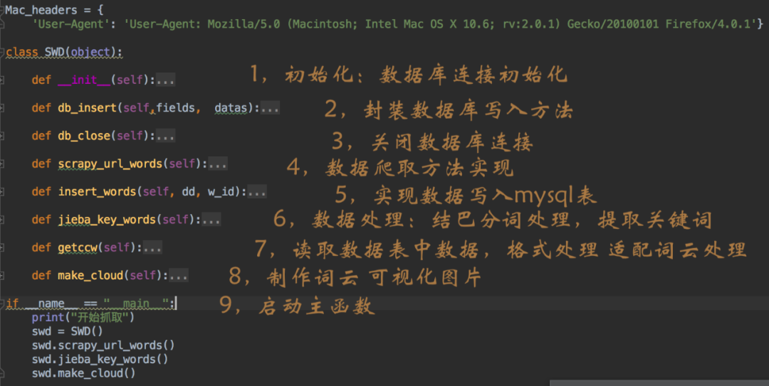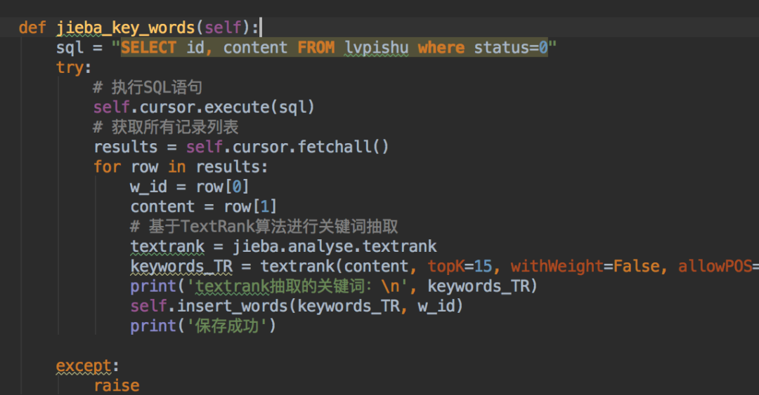 第三步:使用jieba分词,读取mysql数据,并使用jieba分词中的TextRank算法进行关键提取,并inser_word将关键词写入数据表,方便后续的查询分析。