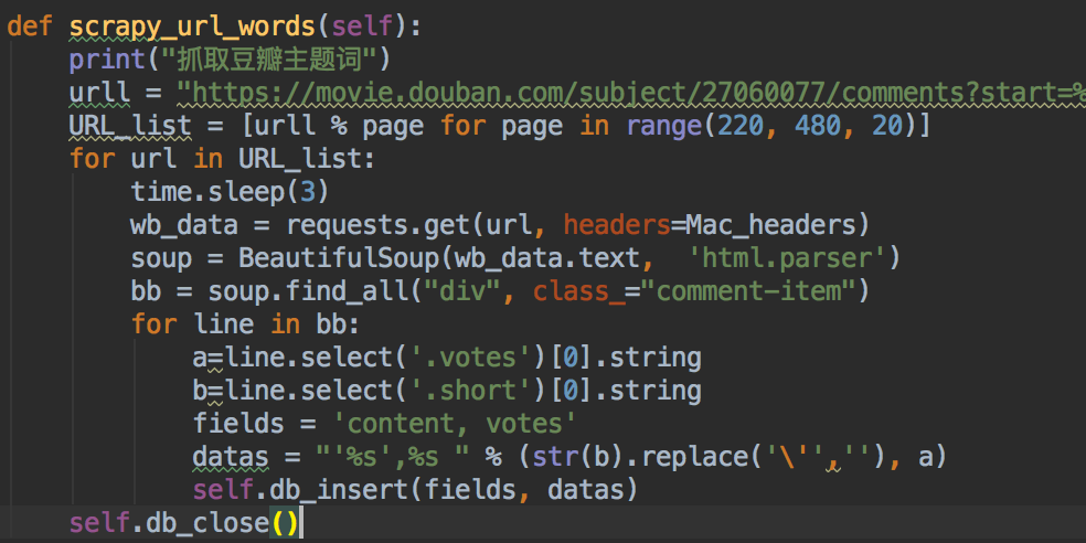 第二步:执行 爬取“豆瓣书评”的函数,设置爬取的目标URL列表,使用BeautifulSoup包完成html文本的解析提取文本信息,然后调用db_insert方法完成数据写入mysql数据表。