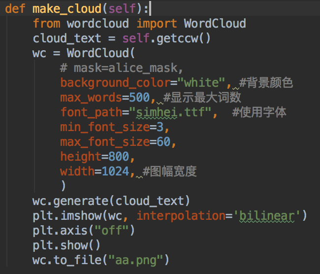 第四步:使用make_cloud 方法,读取mysql中的关键词列表,并配置WordCloud参数,生成词云数据,并使用plt绘制图片。