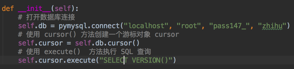 第一步:SWD对象实例化,通过 init 初始化方法实现数据库的连接。代码如下,通过本地Mysql的账号密码连接数据库,创建游标对比cursor,并执行select version 查询mysql的版本信息。