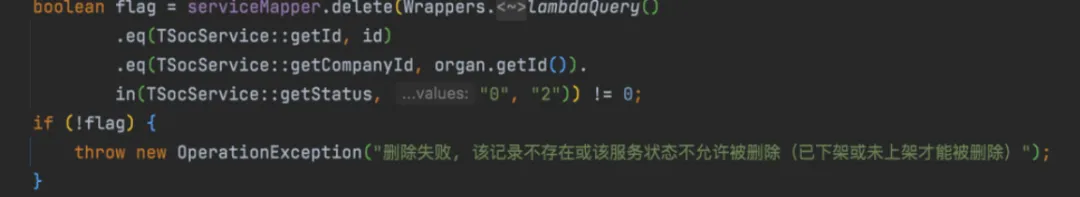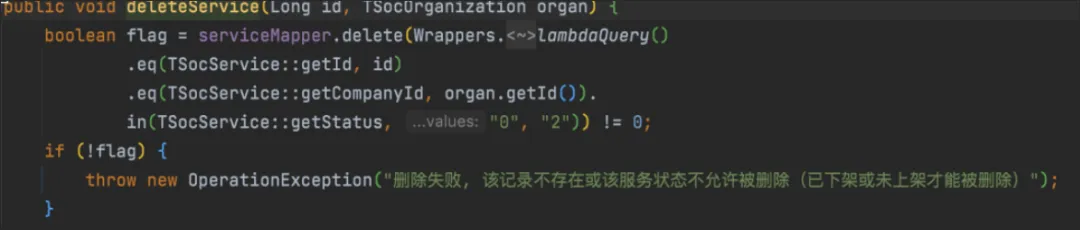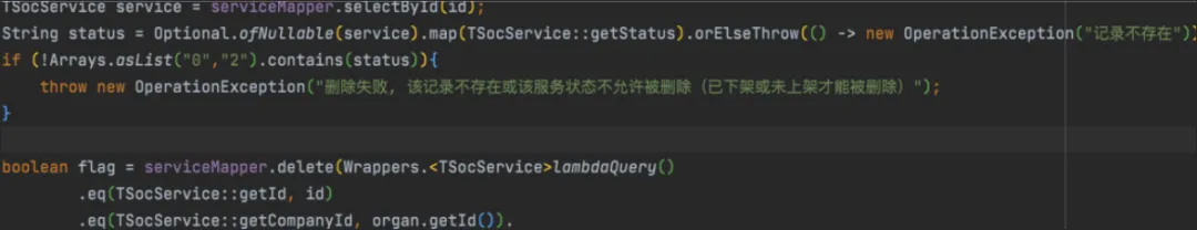 删除一个服务(已下架或未上架的才能删除),之前有看别人写的代码,会先根据id查询该记录,然后做一些判断
